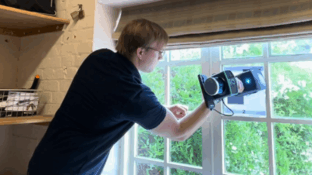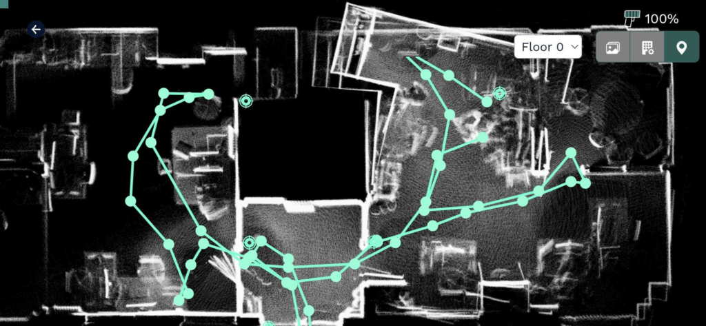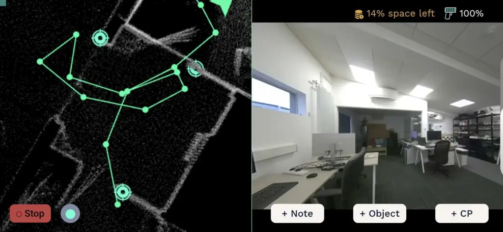 • The left side begins to show a 3D point cloud — a live visualisation of the space you’re capturing, built from thousands of sample points.