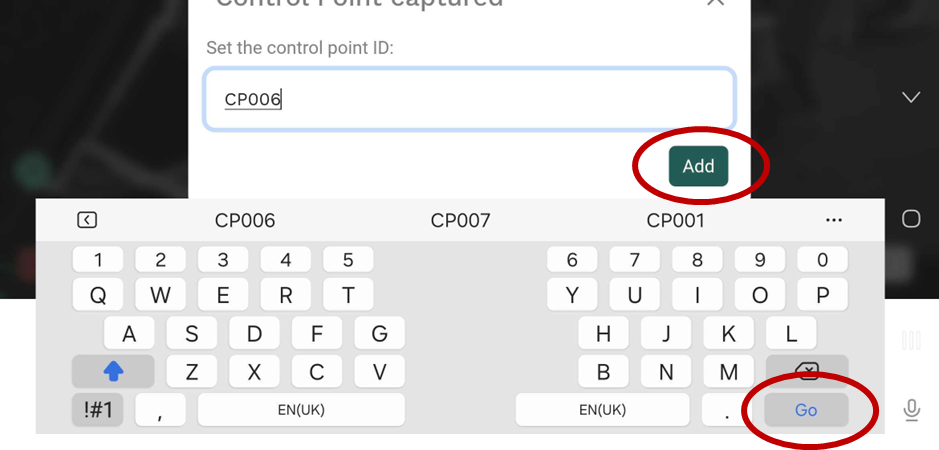 • In the pop-up that opens, enter the name or ID of the control point and tap Go or Add. The name must match the ID used in the external control point file exactly. (see ‘Control Points Files’ section).