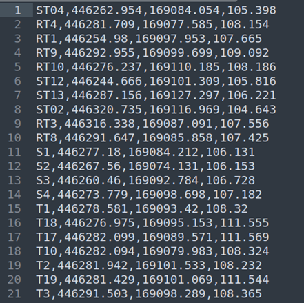 • Columns must be in the following order: Point ID, X (Northing), Y (Easting), Z (Elevation)
