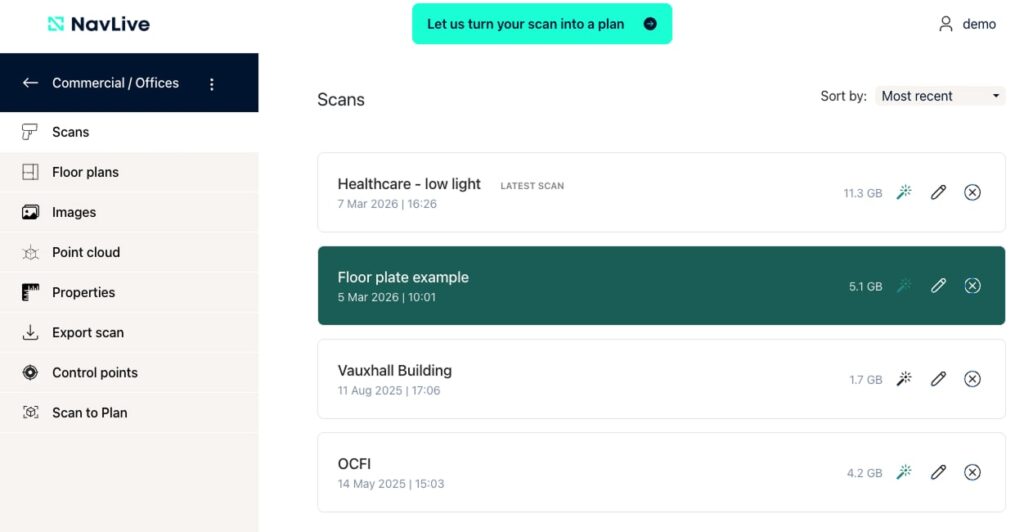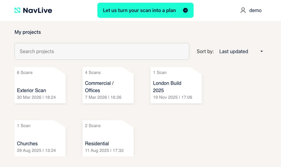You can also access Scan to Plan from the banner at the top of the page or from the left-hand menu (when available). This service converts your scan into architectural drawings, typically within 48 hours. Click here to learn more
